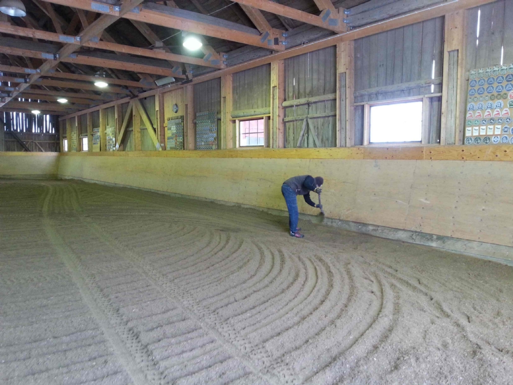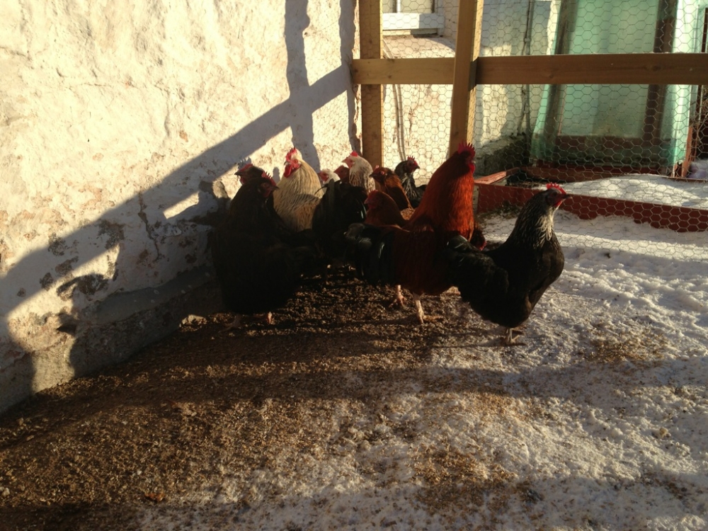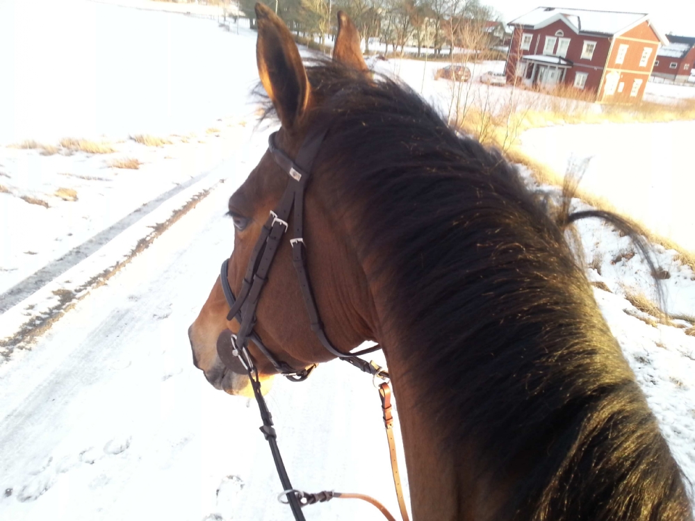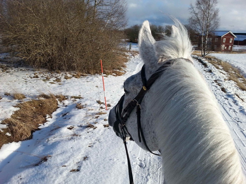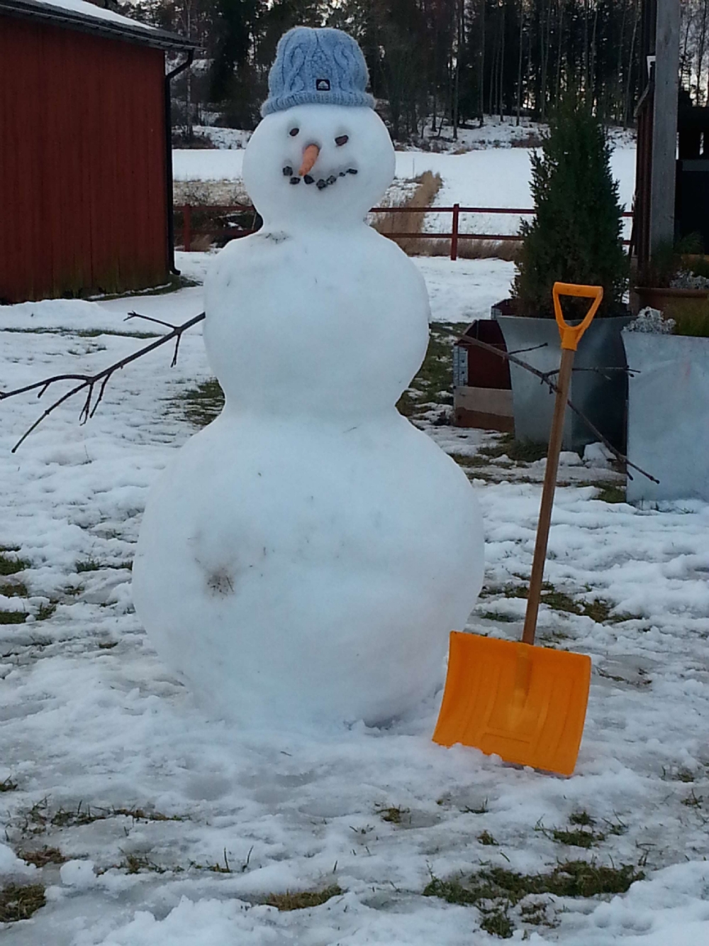 På söndagen fick alla hästarna gå på en promenad i det fina vädret plus att ridhusbotten fick en ordentlig make-over. Viktigt att hålla ordning på underlaget! Gårdagens snöoväder resulterade i en riktigt snygg snögubbe, som dock fick kämpa lite i solen. Hönsen uppskattade solen desto mer och passade på att vara ute i hönsgården och sola sig.