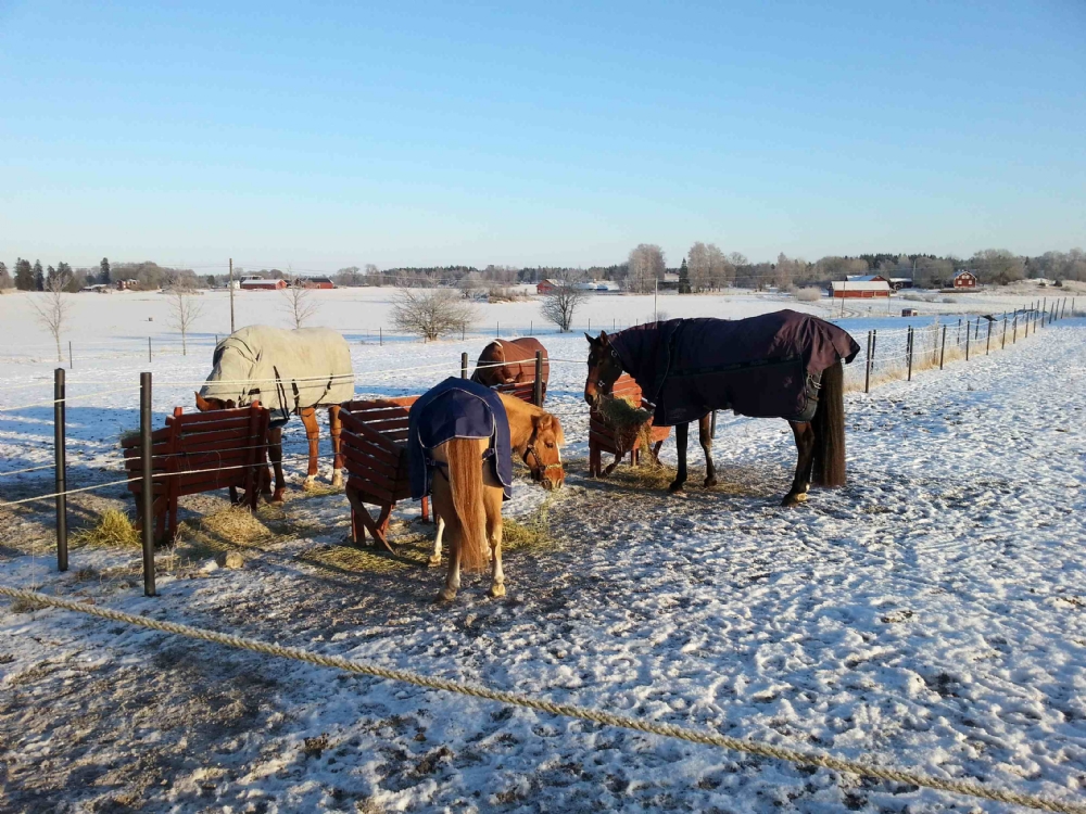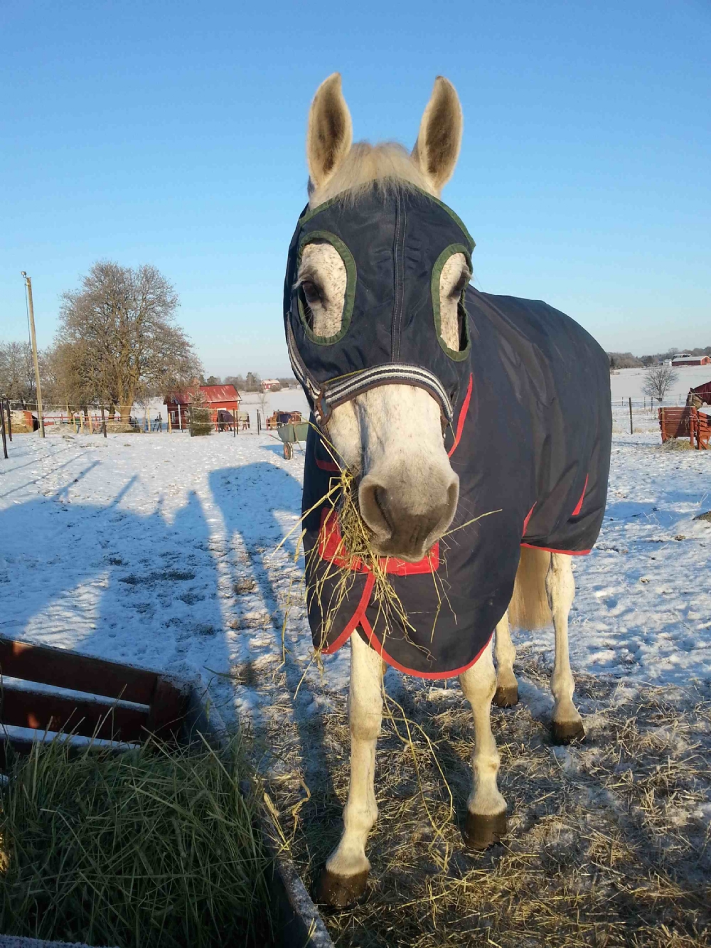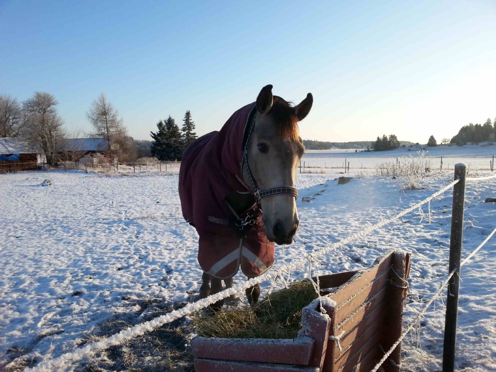 och ser fram emot ett nytt år. Det är kallt ute, nästan -20°, så då får våra hästar bara vara ute i hagen en kort stund och Solan (tax) och Doris (katt) håller koll i fönstret istället för att vara ute på gården. Hästarna har börjat sättas igång ordentligt nu och vi gör i första hand styrketräning, kondition och lösgörande arbete med små hinder och bommar. Kul att snart vara igång med tävlingarna igen!