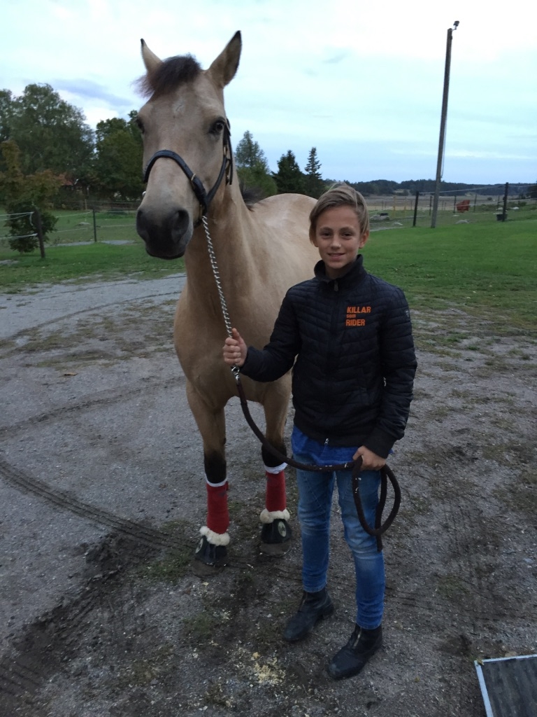 Irländsk gulbrun connemara 147 cm (kat D) f 2009 e. Ardgaineen Boy u. Clonaloun ue. Robin Hood uppf: Patrick O'Callaghan. Placerad i LA hoppning (110 cm). Även om han fortfarande är lite grön, visar han mycket stor kapacitet i hoppning. | ||
